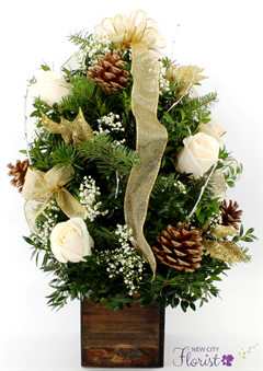 Designed with fresh flowers, this beautiful flower arrangement includes white roses, baby's breathe, and pineocnes among branches of white pine.