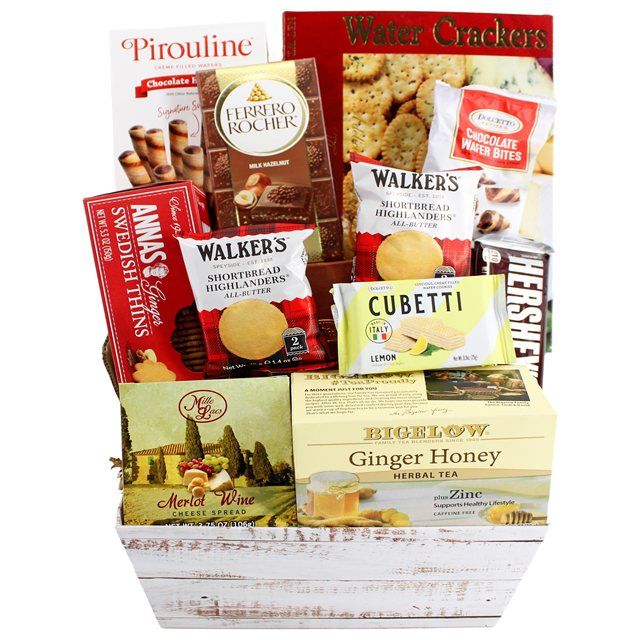 This tasty gourmet gift basket includes crackers, cheese, chocolates, & spreads arranged in a basket!