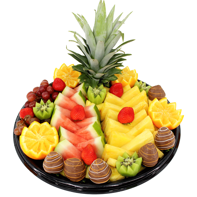Designed with a mix of fresh fruit, this tasty fruit arrangement includes pineapple slices, honey dew slices, orange slices, cantaloupe slices, watermelon slices, strawberries, grapes, and kiwi!