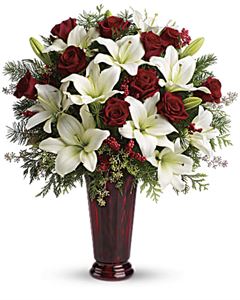 Designed with fresh flowers, this beautiful flower arrangement includes white lilies, red roses and assorted greens.