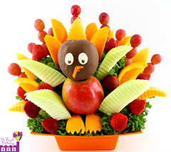 This tasty fruit arrangement includes a festive chocolate covered apple, orange slices, melon wedges, honeydew wedges, strawberry skewers, grape skewers, and kale inside an orange ceramic container