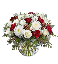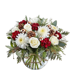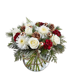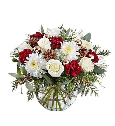 Designed with fresh flowers, this beautiful flower arrangement includes white roses, white cushions, red carnations accented with pine cones and golden ornaments.