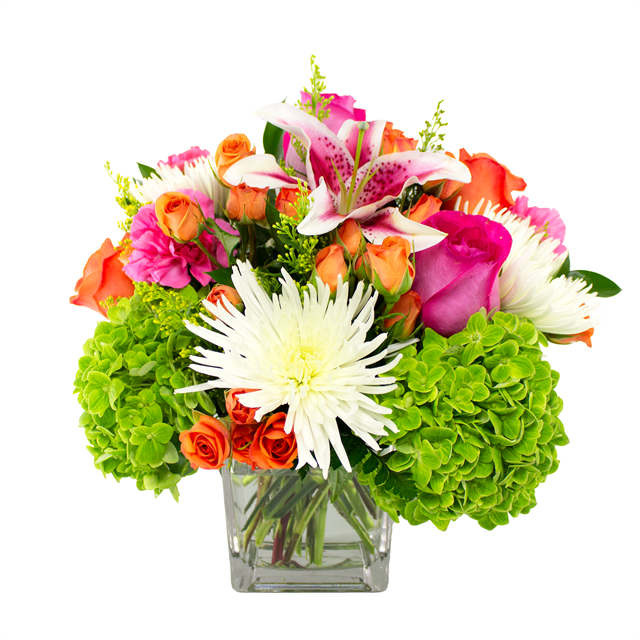 Need to make a great first impression? Look no further than this beautiful flower arrangement that includes pink roses, pink lilies, green hydrangea, Pink Lilies, white spider mums, orange spray roses and mixed assorted greens.