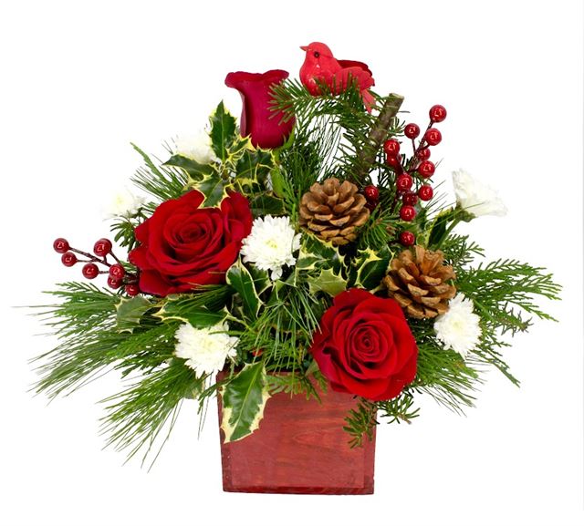Hand-crafted with fresh flowers, this beautiful flower arrangement includes red roses, white buttons, berries, pinecones, with a red bird on top accented with assorted greenery.