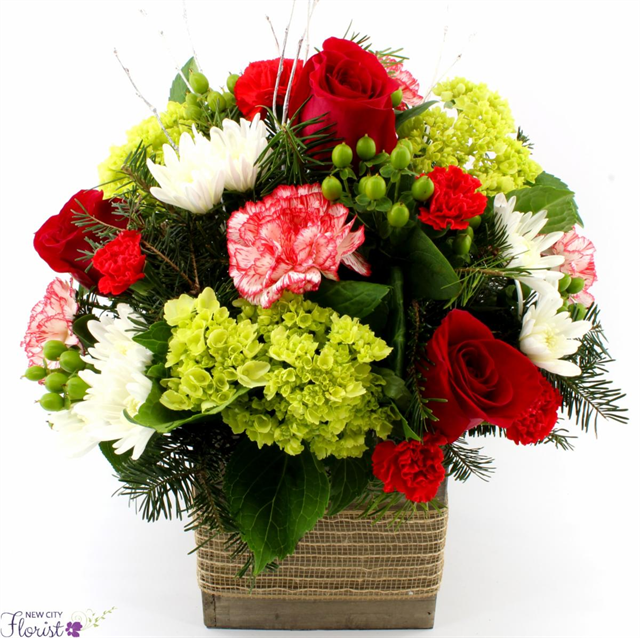 Hand-crafted with fresh flowers, this beautiful flower arrangement includes white roses, red carnations, mums, fresh pine, mini green hydrangeas and assorted greens.