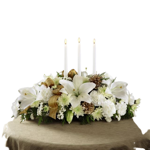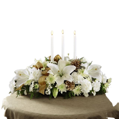 Designed with fresh flowers, this beautiful flower arrangement includes white lilies, white carnations, white mums, pinecones and baby's breath with greens and a gold ribbon.