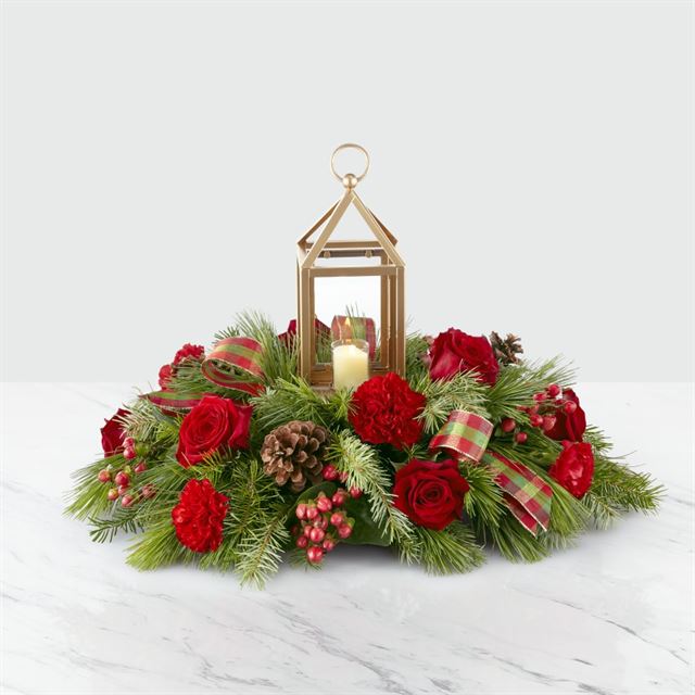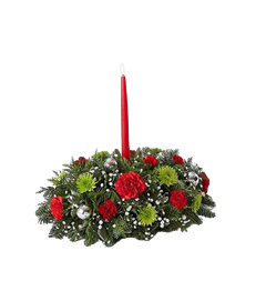 Designed with fresh flowers, this beautiful flower arrangement includes red rose, red carnations, pinecones and red berries with greenery.