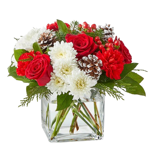 Designed with fresh flowers, this beautiful flower arrangement includes red roses, red carnations, white cushion poms, red hypericum berries, pine cones, and christmas greenery.