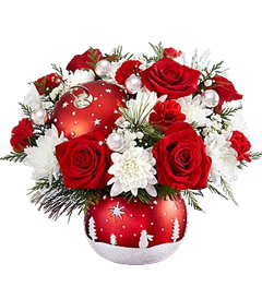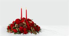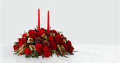Designed with fresh flowers, this beautiful flower arrangement includes red roses, red carnations, pineocnes and assorted greens with two tall candles and a red & green striped ribbon.