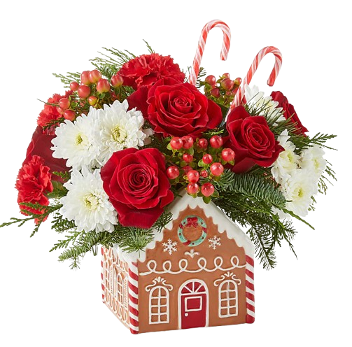 Designed with fresh flowers, this beautiful flower arrangement includes red carnations, red roses, red hypericum berries, white cushion poms, and assorted christmas greens.