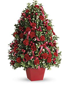 Hand-crafted, this beautiful flower arrangement includes elegant english boxwood stems that are hand arranged to look like a mini Christmas tree, complete with all the festive trimmings!