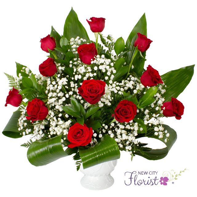 This Funeral Pedestal includes 12 red roses with assorted greens & baby's breath in a white pedestal.