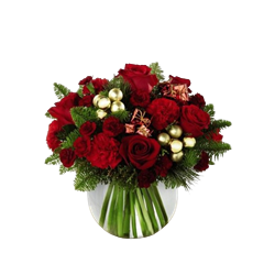 Designed with fresh flowers, this beautiful flower arrangement includes red roses, red spray roses and red carnations accented with gold and red ornaments with Christmas greens.