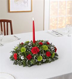 Designed with fresh flowers, this beautiful flower arrangement includes red and green blooms and decorated with delightful ball ornaments and red tapered candles.