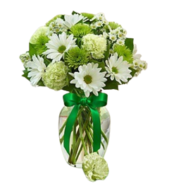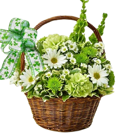 Basket arrangement featuring gorgeous Bells of Ireland flowers, said to bring good luck to anyone who receives them, gathered with fresh green carnations, poms and a shamrock ribbon for a festive finishing touch. Makes a truly original centerpiece for every St. Paddy’s Day celebration.