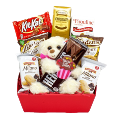 This tasty gift basket includes assorted chocolates, cookies, crackers & more! Includes 1 plush stuffed animal.