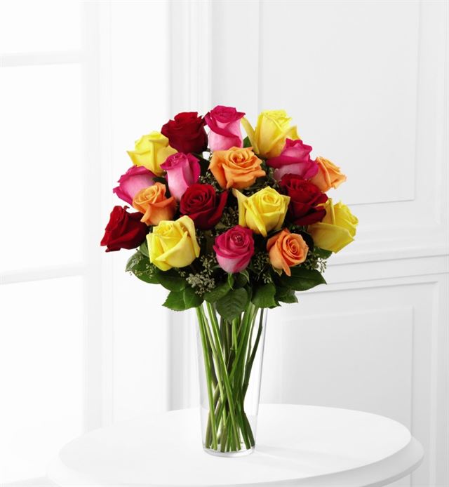 Hand-crafted with fresh flowers, this beautiful arrangement includes 18 long stem assorted roses accented with lush greens, all beautifully arranged in a clear glass vase.